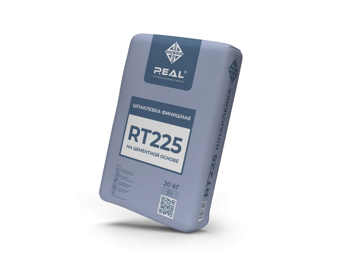 Предназначена для финишного выравнивания поверхностей и заполнения мелких дефектов на бетонных, цементно-песчаных и цементно-известковых основаниях на фасаде, цоколе, а также стенах и потолках снаружи и внутри зданий, в т. ч. во влажных и неотапливаемых помещениях под последующее окрашивание, нанесение декоративных покрытий и оклеивание обоями. Рекомендуется для работ в любых климатических зонах, в том числе с резкими перепадами температур и частыми обильными осадками. Подходит для финишного шпаклевания систем теплоизоляции. Не рекомендуется применение шпаклевки финишной РЕAL RT225 для выравнивания поверхностей на гипсовой основе.